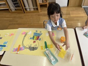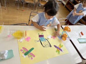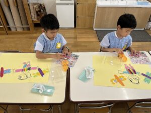 制作では、「秋の絵」でトンボとコスモスを作りました。子どもたちがそれぞれ考えたトンボは、色とりどりで特別なトンボになりました。