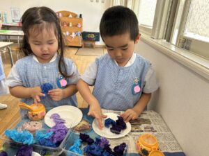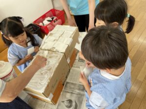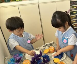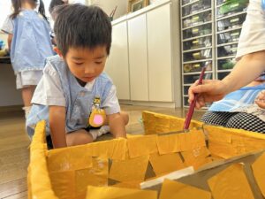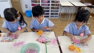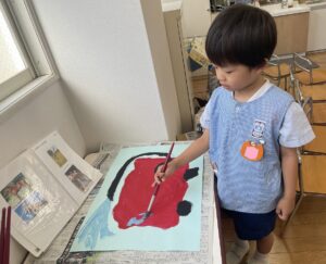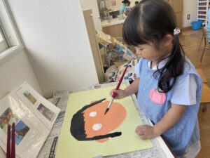 ぬりひろげでは、絵の具をグルグル広げて塗りながら、自分の好きな人・乗り物・動物などを描いています!