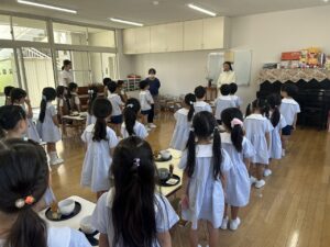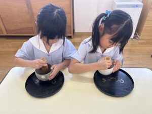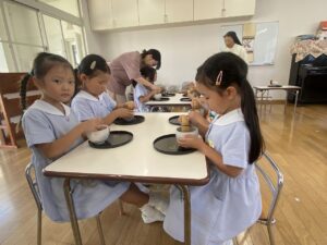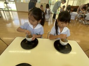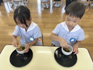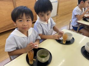 初めてお茶を点てる年長さん。左手でお茶碗を持ち、右手に茶筅を持ちお茶を点てていきました。お茶碗の中にたくさんの泡ができ、とっても美味しいお茶が出来上がりましたね。みんな、とってもじょうずでしたよ!!