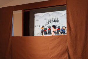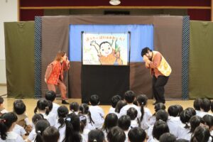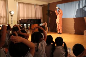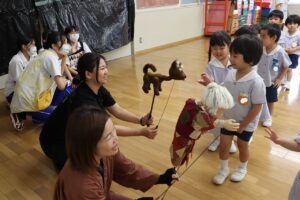 今日は全園児がホールに集まり、人形劇を観劇しました。