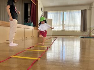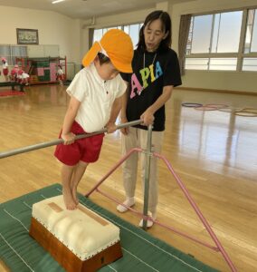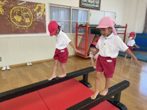 次はみんなの番です。鉄棒、平均台、ケンケンパなどたくさん頑張りました!
