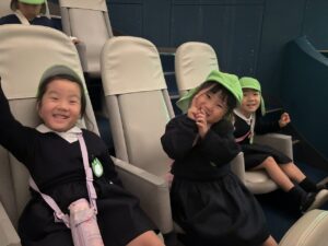 大きなスクリーンを見てドキドキワクワクの子どもたち。