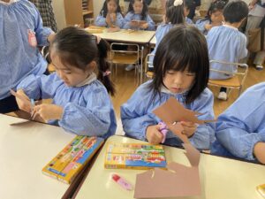 その後は、横割りのお部屋に分かれてカレンダー制作をしました。今日は木を自分で描き、はさみで切りました。