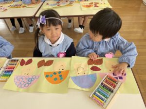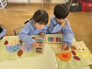 秋についてたくさん考えました。葉っぱの色が変わってきていることや少し寒くなってきたことに気が付きましたね!