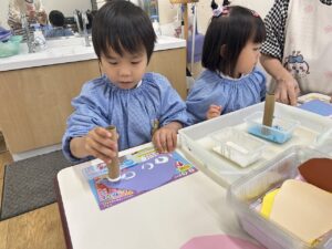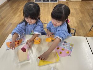 「きのこ」「どんぐりころころ」「まつぼっくり」秋のお歌を歌いながら楽しく取り組む姿がありました♪
