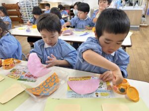 きのこに模様を付けました。きらきらの折り紙をはったり、スタンプをしたり、好きな模様にしましたね!
