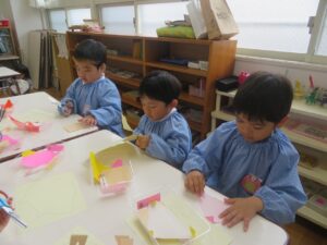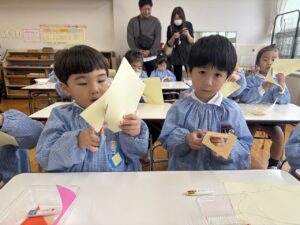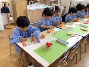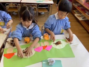 横割では秋の制作をしました。折り紙と画用紙を使ってきのことハリネズミを作っていきます。