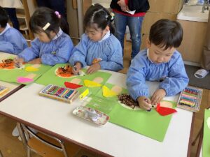 クレパスで模様や顔を描きながら、周りにどんぐりや落ち葉を描いているお友だちもいましたね。
