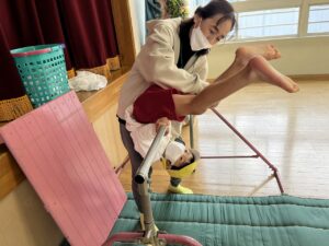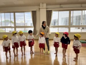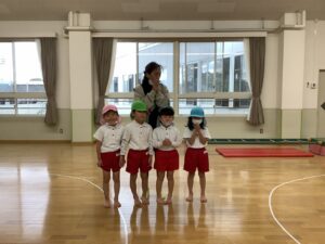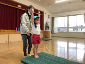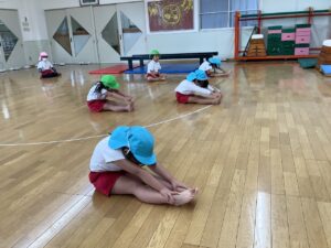 準備体操は、足を広げたり手をぶらぶらさせて柔らかくしたりと前の先生を見ながらできました。