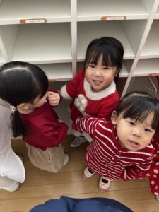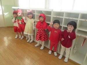 満三・二歳児さんは、サンタさんになりきって楽しく踊りました♪とっても上手にできましたね♡