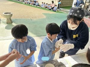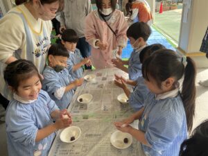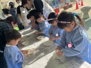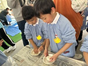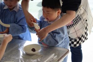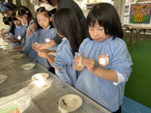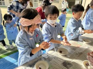 粒粒のおこめからつやつやのお餅に変身していくお餅を見て、「はやくたべたいなあー」というお声が聞こえてきました。まだまだ、次はお餅を小さくちぎって丸めますよ!