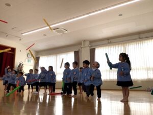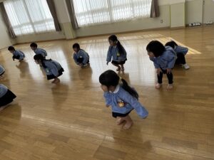 最初は、みんな大好きなちょっとだけ体操です。ちょっとだけ回る、ちょっとだけしゃがむ、ちょっとだけ足を開く… みんな”ちょっとだけ”の動きがとても上手です!
