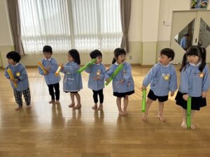 今回はドレミパイプという楽器も使いました。いろんな色の長いパイプ、本当に楽器なのかな?…と触ってみたりのぞき込んだりする子どもたち。叩いてみると音が鳴りました!