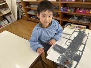 先日ローラーを使って『道路』を描きました。今日はその道路の上に家やお店、人などを描いて自分の街を作りました。
