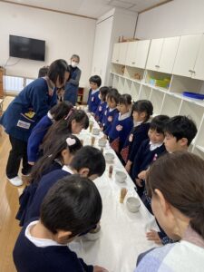 今回はロザリオのお友達が亭主、さくら幼稚園のお友だちがお客さんとなり、いつも村上先生に教えて頂いているお作法でさくら幼稚園の皆さんをおもてなしです。