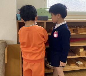 ご飯の後はいつもしているお仕事を一緒にしました。使い方を教えてあげたり楽しく遊びました。