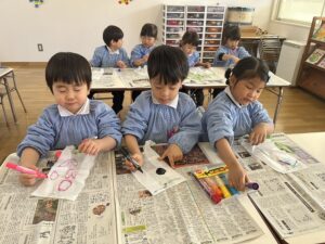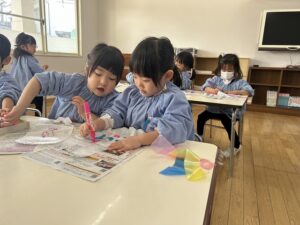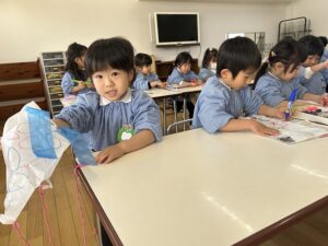 一月の絵本観察で凧揚げを作っているお話が出てきたのを見て、「作ってみたい!」と興味をもった子どもたち。