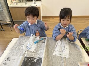 「お空に高く上げるから、空を飛んでるちょうちょを描こうかな!」「夢に出てきた宇宙人を描く!」とそれぞれ自由に描きました。