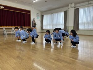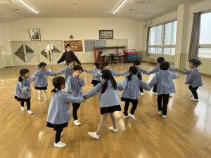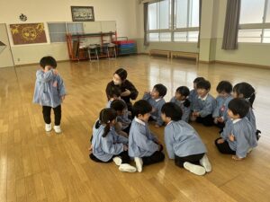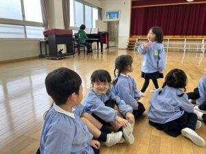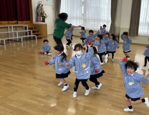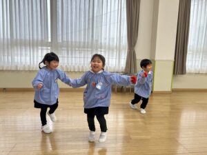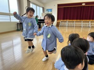 さあ、お友達を見つけたら手を繋いでスキップ!円になって座っているお友達は、手拍子をしながら「次は私かな?」とドキドキしていましたね!