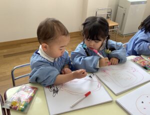 音楽発表会の練習が終わったら自由画帳にお絵描きをしたり、絵本観察をしたりお外遊びをして過ごしています。