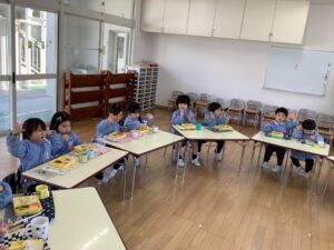 お友達のお顔を見ながらお弁当給食を美味しくいただきましたよ。