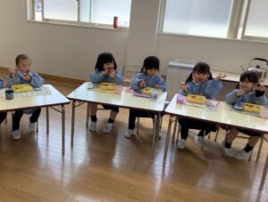 今日のお弁当は二歳児、満三歳児のお友達で食べました。