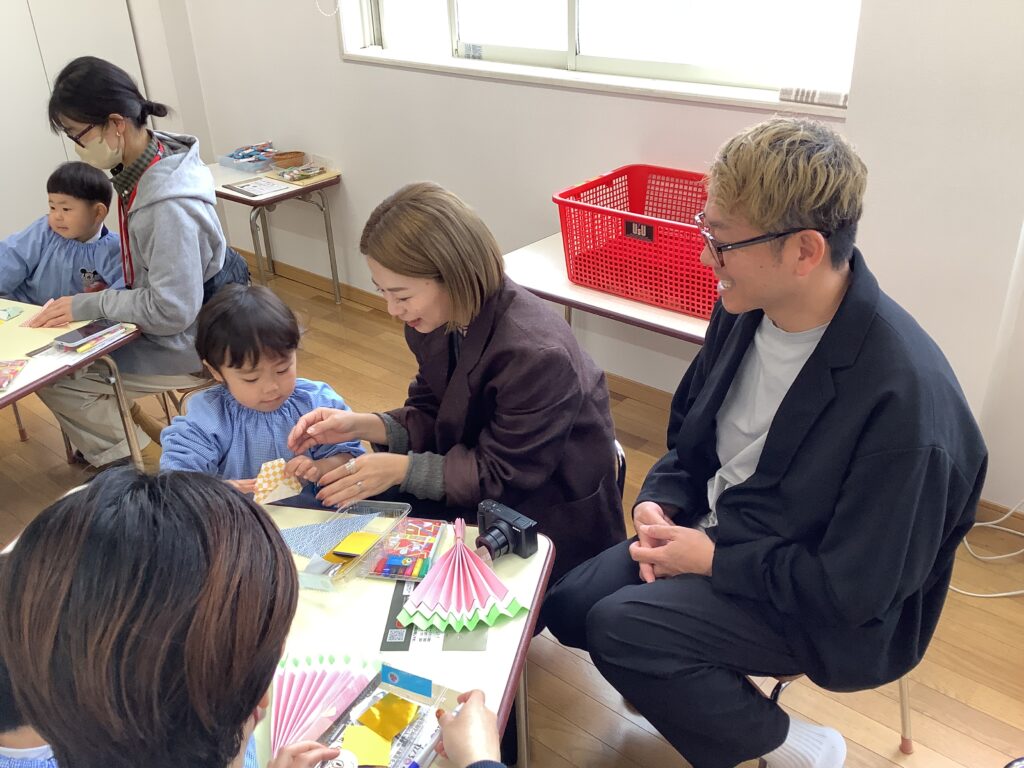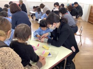 次はお家の方の出番です。画用紙や折り紙を折ったり、飾りを切ったり…お父さん、お母さんも頑張っていました。