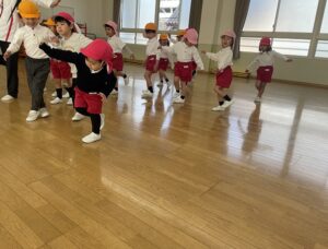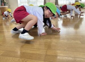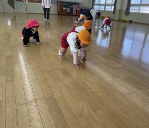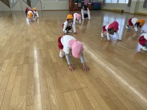 まずは、ホールでマラソンをしてから、速く走るためのくま歩きやうさぎ跳びを練習しました。