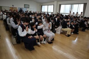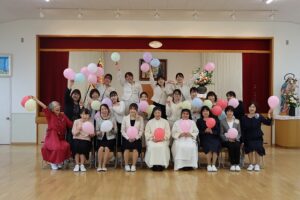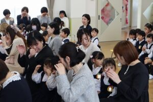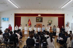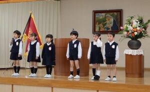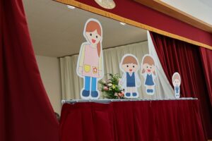 式では年長のお兄さんお姉さんたちのご挨拶。年中、年長のお友だちによる歌のプレゼント、そして先生たちによるペープサート劇をしました。
