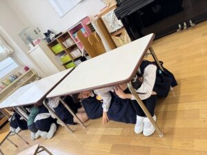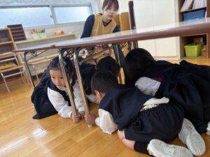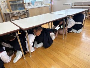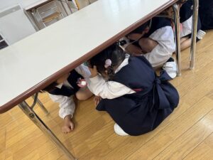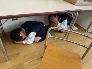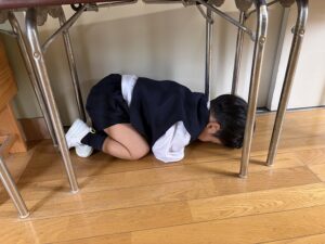 「地震です。」の放送が鳴るとみんな一斉に机の下に隠れます。